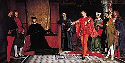 Scholars have often speculated that Hamlet's Polonius might have been inspired by William Cecil (Lord Burghley)—Lord High Treasurer and chief counsellor to Queen Elizabeth I. E. K. Chambers suggested Polonius's advice to Laertes may have echoed Burghley's to his son Robert Cecil.[27] John Dover Wilson thought it almost certain that the figure of Polonius caricatured Burghley.[28] A. L. Rowse speculated that Polonius's tedious verbosity might have resembled Burghley's.[29] Lilian Winstanley thought the name Corambis (in the First Quarto) did suggest Cecil and Burghley.[30] Harold Jenkins considers the idea that Polonius might be a caricature of Burghley is a conjecture, and may be based on the similar role they each played at court, and also on the fact that Burghley addressed his Ten Precepts to his son, as in the play Polonius offers "precepts" to Laertes, his son.[31] Jenkins suggests that any personal satire may be found in the name "Polonius", which might point to a Polish or Polonian connection.[32] G. R. Hibbard hypothesised that differences in names (Corambis/Polonius:Montano/Raynoldo) between the First Quarto and other editions might reflect a desire not to offend scholars at Oxford University.[c]