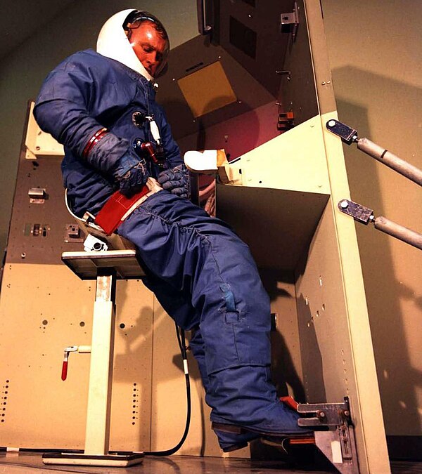 The MOL program's requirements for a spacesuit were a product of the spacecraft design. The Gemini capsule had little room inside, and the MOL astronauts gained access to the laboratory through a hatch in the heat shield. This required a more flexible suit than those of NASA astronauts. The NASA astronauts had custom-made set of flight, training and backup suits, but for the MOL the intention was that spacesuits would be provided in standard sizes with adjustable elements. The USAF sounded out the David Clark Company, International Latex Corporation, B. F. Goodrich and Hamilton Standard in 1964. Hamilton Standard and David Clark each developed four prototype suits for the MOL.[65] A competition was held at Wright-Patterson Air Force Base in January 1967, and a production contract awarded to Hamilton Standard. At least 17 blue MOL MH-7 training suits were delivered between May 1968 and July 1969. A single MH-8 flight configuration suit was delivered in October 1968 for certification testing. The flight suit was intended to be worn during launch and reentry.[66]