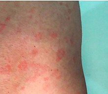 Secondary syphilis occurs approximately four to ten weeks after the primary infection.[2] While secondary disease is known for the many different ways it can manifest, symptoms most commonly involve the skin, mucous membranes, and lymph nodes.[21] There may be a symmetrical, reddish-pink, non-itchy rash on the trunk and extremities, including the palms and soles.[2][22] The rash may become maculopapular or pustular.[2] It may form flat, broad, whitish, wart-like lesions on mucous membranes, known as condyloma latum.[2] All of these lesions harbor bacteria and are infectious.[2] Other symptoms may include fever, sore throat, malaise, weight loss, hair loss, and headache.[2] Rare manifestations include liver inflammation, kidney disease, joint inflammation, periostitis, inflammation of the optic nerve, uveitis, and interstitial keratitis.[2][23] The acute symptoms usually resolve after three to six weeks;[23] about 25% of people may present with a recurrence of secondary symptoms.[21][24] Many people who present with secondary syphilis (40–85% of women, 20–65% of men) do not report previously having had the classical chancre of primary syphilis.[21]