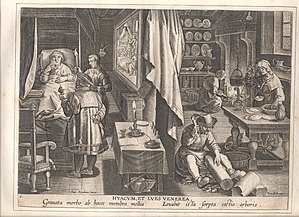 The Flemish artist Stradanus designed a print called Preparation and Use of Guayaco for Treating Syphilis, a scene of a wealthy man receiving treatment for syphilis with the tropical wood guaiacum sometime around 1590.[94]